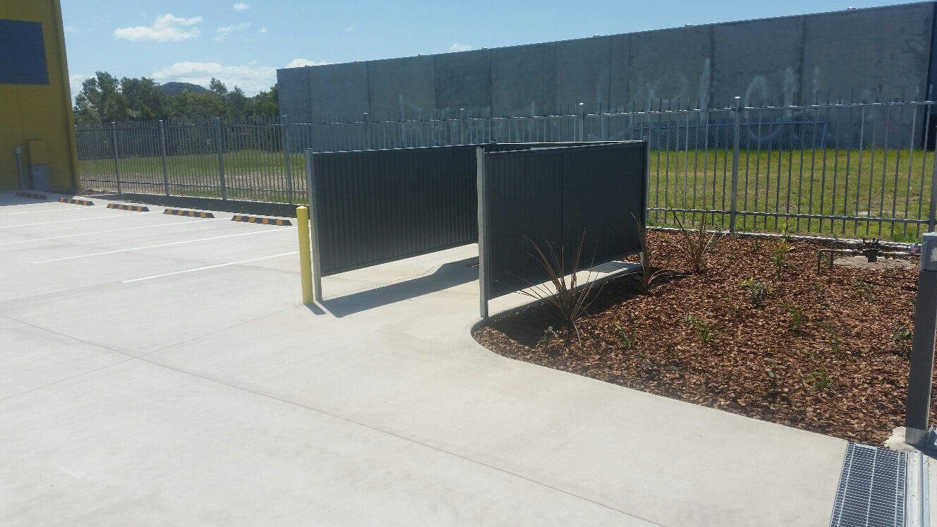 | Front of shed from mezzanine. | Front of shed from interior. | Security fence and garden. |